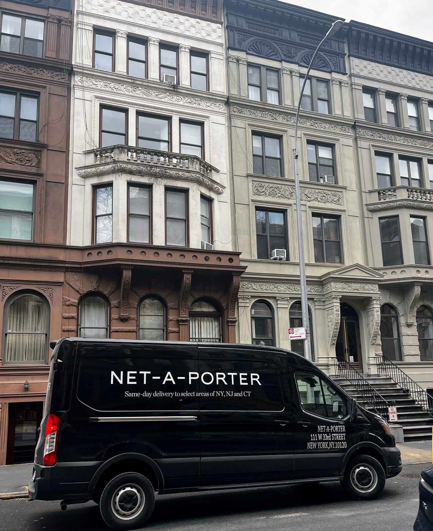 I first saw the Net-a-Porter van outside a cozy-looking brownstone right off Central Park West, and have spotted it twice since. Each time I’ve wanted to chase after it and ask if I can look inside, and then ask if I can come up with the delivery driver and see where they are delivering, and maybe can I come in and borrow an outfit? It’s such a chic vehicle–jet black, minimal lettering–and who knows what’s inside. Is it a Khaite cashmere cardigan? A Loro Piana skirt? Who knows!